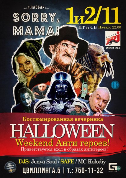 1 и 2 Ноября Sorry, Mama собирает нечисть! Если ты в детстве симпатизировал отрицательным персонажам мультфильмов, восхищаешься изобретательностью доктора зла, харизматичностью Джоккера и сексуальностью ведьм, то ждем тебя в ГлавБаре Sorry, Mama в костюме любимого персонажа на самых ужасных вечеринках сезона!